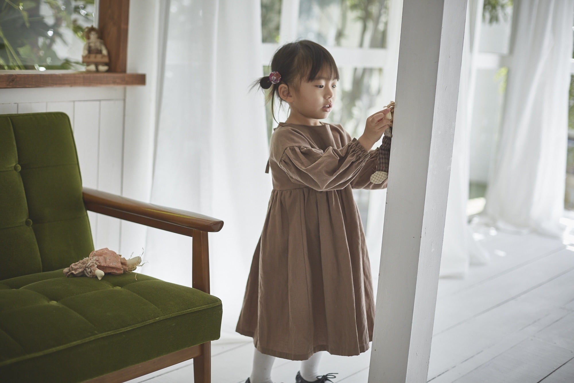 肩落ち(dropped shoulder)ギャザーたっぷりのお袖に後ろはリボンが愛らしいワンピース。